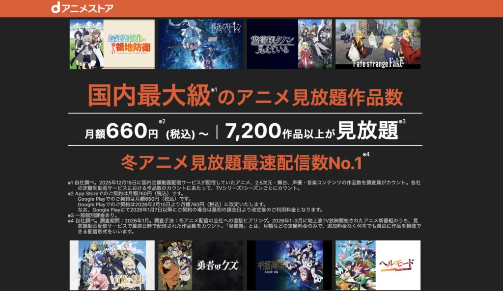 特に、dアニメストアはアニメの最速配信や先行配信が多く、マイナーな作品まで揃うので、アニメファンには魅力的なサービスでしょう。