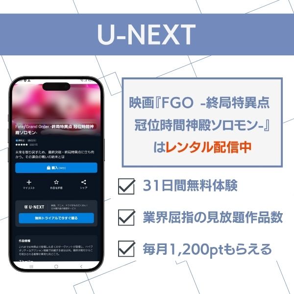 『Fate/Grand Order -終局特異点 冠位時間神殿ソロモン-』は見放題対象ではなくレンタル配信作品ですが、U-NEXTの初回登録時に付与される特典ポイントは、レンタル作品の視聴にも使えます。