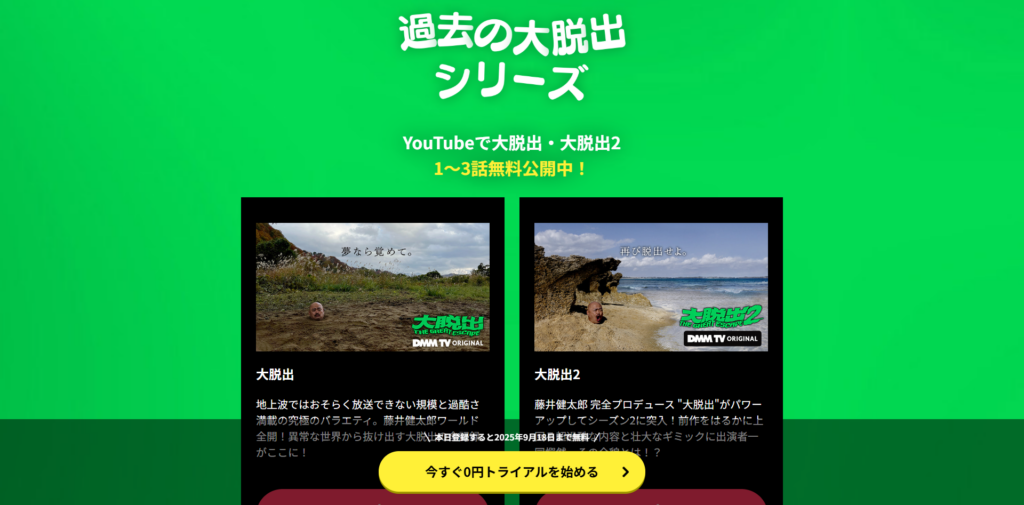 DMM TVなら14日間の無料トライアルを利用でき、期間中に『大脱出』シリーズをまとめて無料視聴できます。