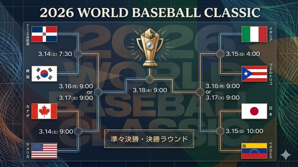 WBC2026の準々決勝は3月14日(土)・15日(日)の2日間。侍ジャパンは3月15日(日) 10:00〜、ベネズエラと対戦します。