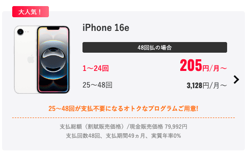 | ワイモバイル | iPhone 16e(128GB):119,088円 →月205円×24回=実質4,920円(114,168円お得) |