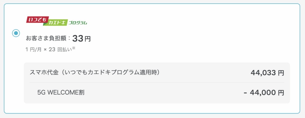 さらに、「5G WELCOM割」と「いつでもカエドキプログラム」を併用した場合、128GBではiPhone16が実質負担額33円で利用でき、非常にお得です。