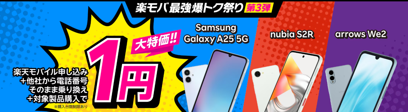 乗り換え(MNP)で楽天モバイルのarrows We2・Samsung Galaxy A25 5G・nubia S2Rが一括1円になる特大キャンペーン開催中!! 防水・防塵・耐衝撃の高性能を備えた国産スマホが実質無料で手に入るチャンス。