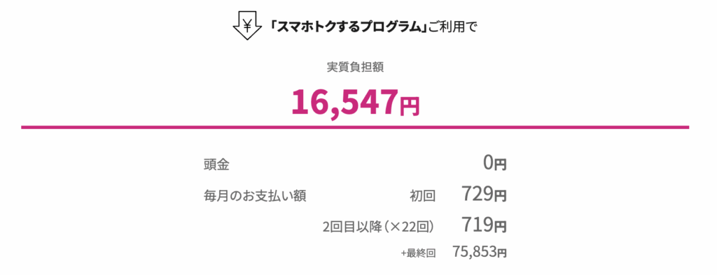 | 【大還元祭】 スマホトクするプログラム | 毎月の支払いが軽減 25ヶ月目に機種を返却すると残りの支払い不要 iPhone15が実質47円 | 開始:2024年6月3日 終了:未定 |