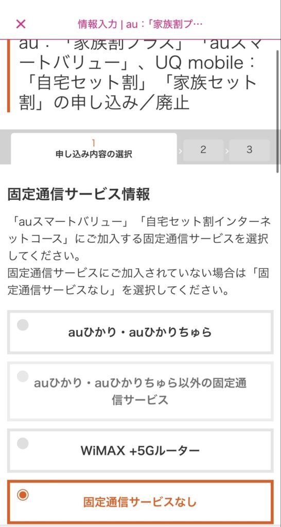 「1申込内容の選択 固定通信サービス情報」の「固定通信サービスなし」を選択します。