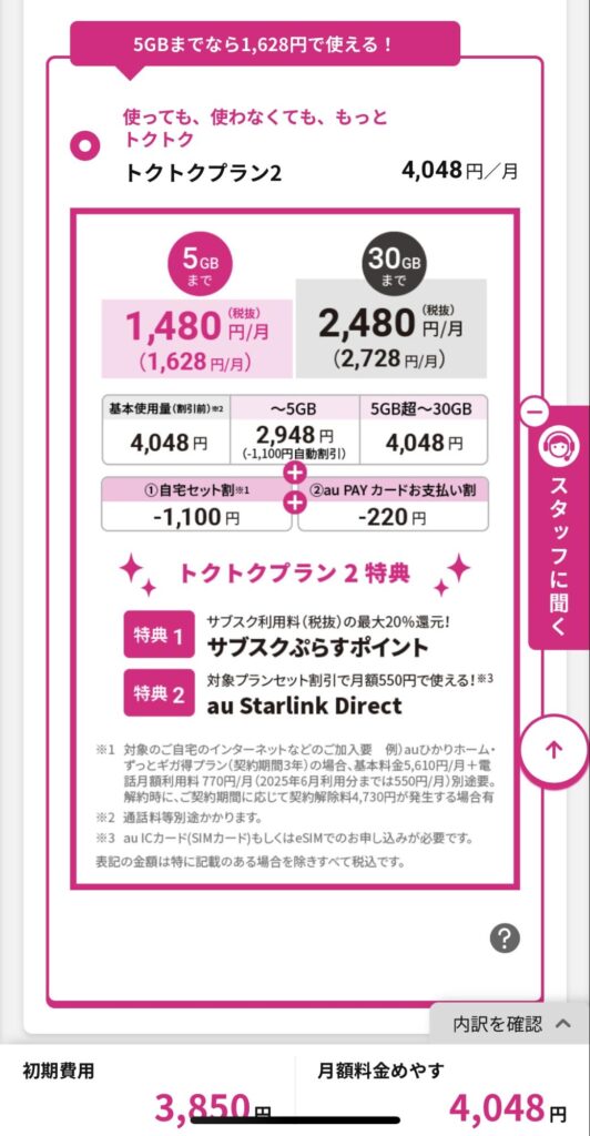 | 〜5GB | 月2,948円 ※~5GBデータ利用時割引(-1,100円)自動適用 |