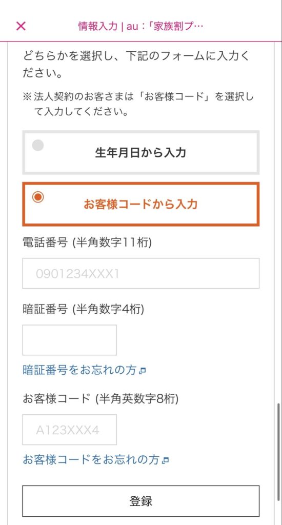 お客様コードがわかる方は「お客様コードから入力」から情報を入力してもOKです。