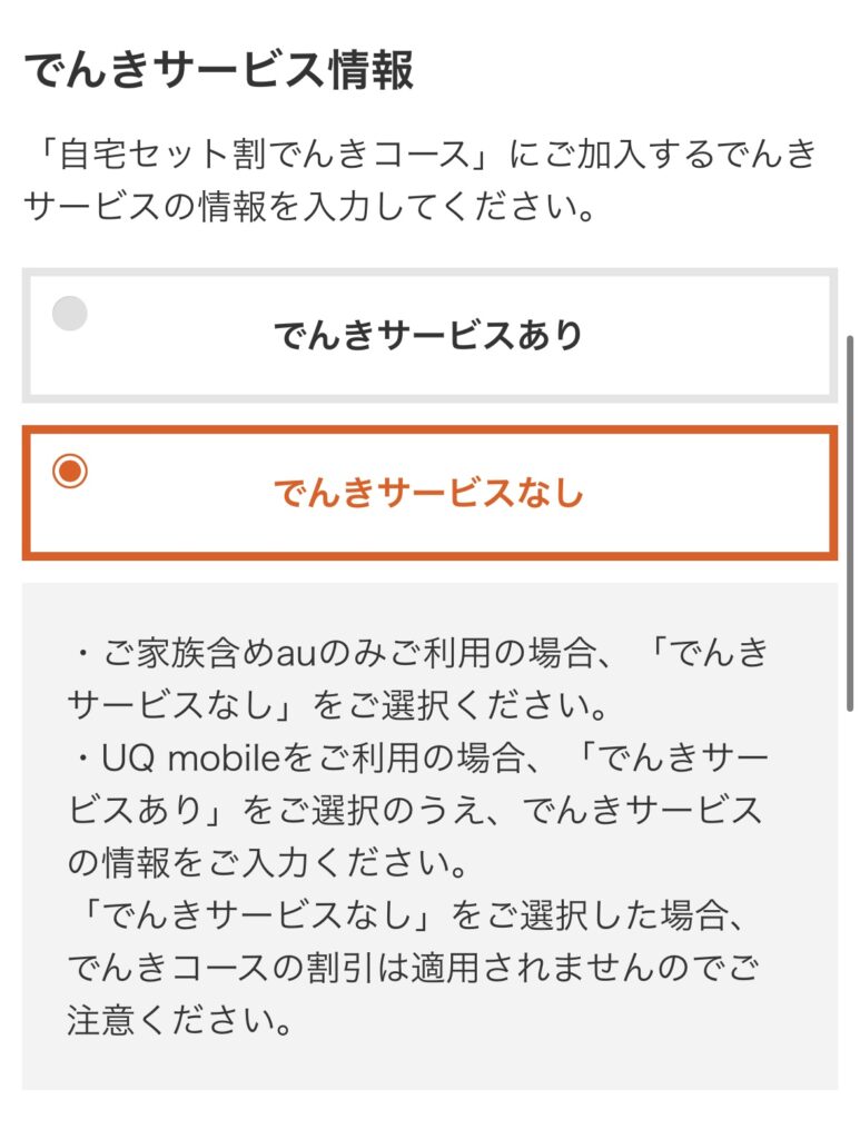 「1申込内容の選択 でんきサービス情報」の「でんきサービスなし」を選択します。