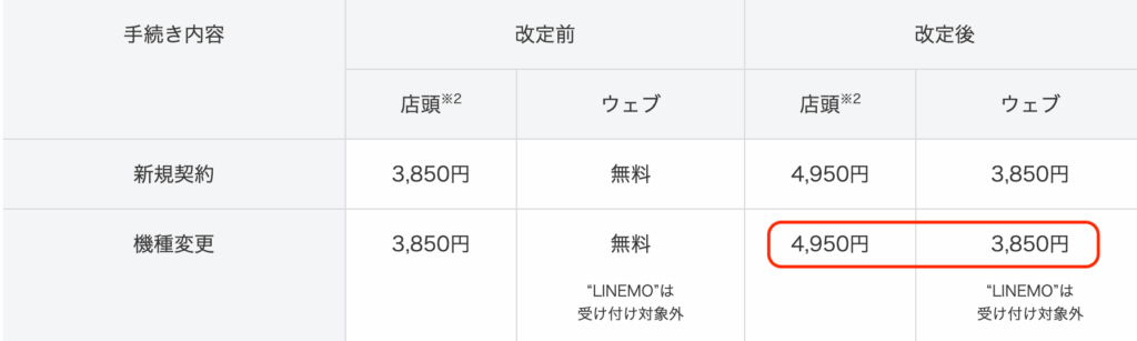 ワイモバイルでは、2025年8月20日以降、オンラインでの機種変更にも事務手数料が必要となり、店頭での手続きも4,950円に値上がりしました。