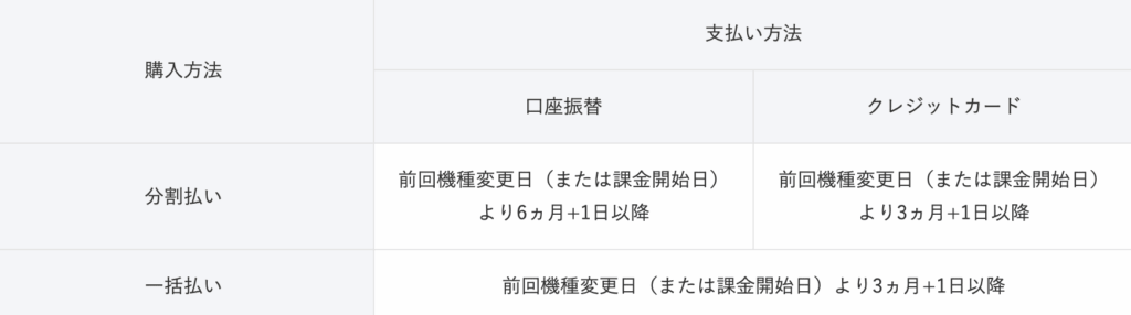 現在利用中の端末の支払い方法により、機種変更ができる時期が異なります。